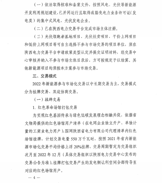 近日,陜西省發(fā)改委發(fā)布《陜西省2022年新能源發(fā)電企業(yè)參與市場(chǎng)化交易實(shí)施方案》。方案指出,2022年新能源參與市場(chǎng)化交易以中長(zhǎng)期為主,交易模式分為:掛牌交易、雙邊協(xié)商交易。