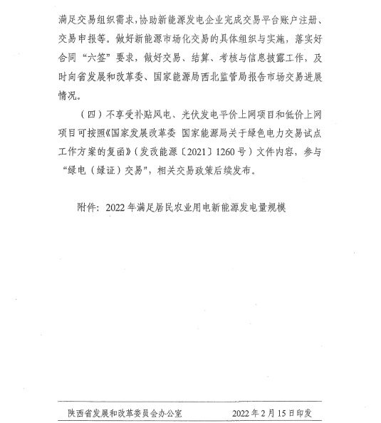 2022年,將納入規(guī)劃的風(fēng)電、光伏發(fā)電電量?jī)?yōu)先用于保障省內(nèi)居民、農(nóng)業(yè)用電,執(zhí)行政府定價(jià),這部分電量需求約200.43億千瓦時(shí)(分月預(yù)測(cè)情況見附表)。剩余發(fā)電電量參與市場(chǎng)化交易,執(zhí)行市場(chǎng)化交易形成的價(jià)格。滿足市場(chǎng)需求之外仍有富余發(fā)電能力,將作為電網(wǎng)企業(yè)代理購(gòu)電電量來源,執(zhí)行政府定價(jià)。