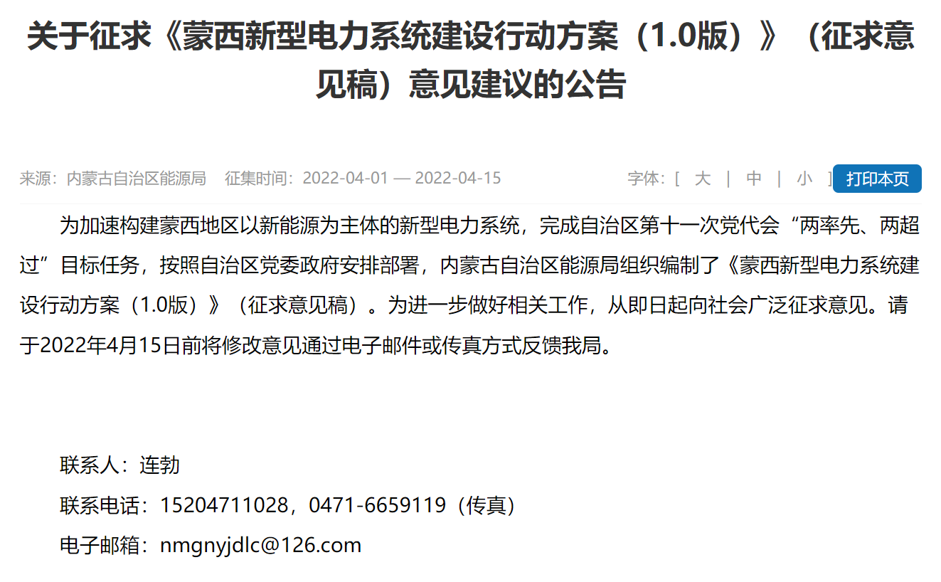 4月14日,內(nèi)蒙古自治區(qū)能源局發(fā)布關(guān)于征求《蒙西新型電力系統(tǒng)建設(shè)行動(dòng)方案(1.0版)》(征求意見稿)意見建議的公告,為加速構(gòu)建蒙西地區(qū)以新能源為主體的新型電力系統(tǒng),進(jìn)一步做好相關(guān)工作,從即日起向社會(huì)廣泛征求意見。征集時(shí)間為2022年4月1日—2022年4月15日。