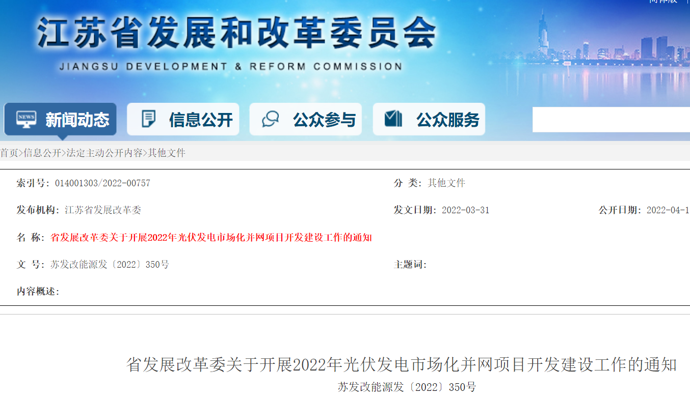 從江蘇省發(fā)改委官網(wǎng)獲悉:4月12日,江蘇省發(fā)展改革委發(fā)布關(guān)于開展2022年光伏發(fā)電市場化并網(wǎng)項(xiàng)目開發(fā)建設(shè)工作的通知,要求各投資開發(fā)企業(yè)可于本通知發(fā)布之日起在“江蘇省新能源管理平臺”進(jìn)行項(xiàng)目申報(bào),形成集中式光伏發(fā)電項(xiàng)目庫,所有申報(bào)項(xiàng)目首先納入項(xiàng)目儲備庫。