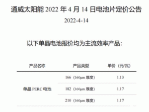 2022年4月14日,通威太陽(yáng)能官網(wǎng)公布了最新的單晶太陽(yáng)能電池片定價(jià)公告。與上次報(bào)價(jià)相比,其中單/雙面166報(bào)價(jià)1.13元/W,漲價(jià)1.8%!單/雙面182報(bào)價(jià)1.17元/W,漲價(jià)1.7%;單/雙面210報(bào)價(jià)1.17元/W,漲價(jià)0.9%。