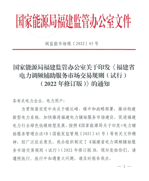 為推動構(gòu)建新型電力系統(tǒng),加快推進(jìn)福建電力輔助服務(wù)市場建設(shè),促進(jìn)福建電力行業(yè)綠色低碳轉(zhuǎn)型發(fā)展,福建能源監(jiān)管辦于近日印發(fā)了《福建省電力調(diào)頻輔助服務(wù)市場交易規(guī)則(試行)(2022年修訂版)》(以下簡稱《調(diào)頻規(guī)則》),F(xiàn)從文件出臺背景、主要內(nèi)容等方面進(jìn)行解讀。