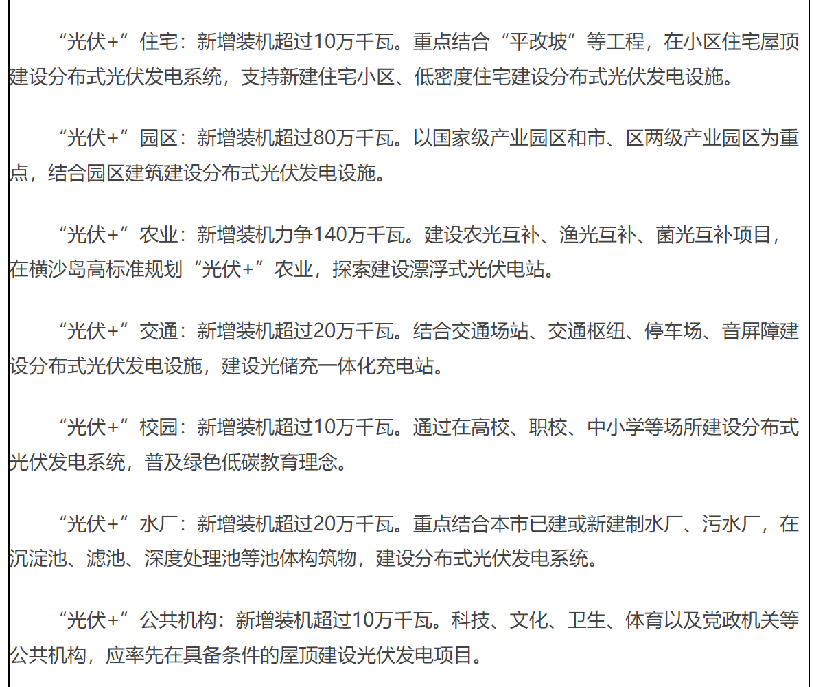 “光伏+”交通:新增裝機(jī)超過(guò)20萬(wàn)千瓦。結(jié)合交通場(chǎng)站、交通樞紐、停車場(chǎng)、音屏障建設(shè)分布式光伏發(fā)電設(shè)施,建設(shè)光儲(chǔ)充一體化充電站。