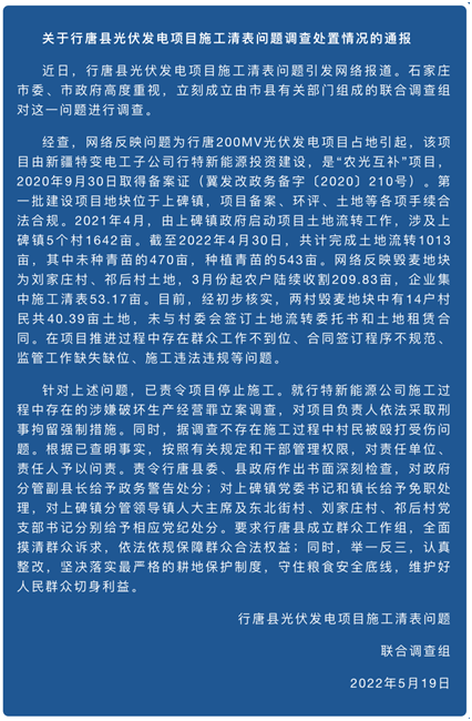 5月19日,聯(lián)合調(diào)查組發(fā)布通報稱,行唐200MV光伏發(fā)電項目,由新疆特變電工子公司行特新能源投資建設(shè),是“農(nóng)光互補(bǔ)”項目,2020年9月30日取得備案證(冀發(fā)改政務(wù)備字〔2020〕210號)。第一批建設(shè)項目地塊位于上碑鎮(zhèn),項目備案、環(huán)評、土地等各項手續(xù)合法合規(guī)。2021年4月,由上碑鎮(zhèn)政府啟動項目土地流轉(zhuǎn)工作,涉及上碑鎮(zhèn)5個村1642畝。截至2022年4月30日,共計完成土地流轉(zhuǎn)1013畝,其中未種青苗的470畝,種植青苗的543畝。網(wǎng)絡(luò)反映毀麥地塊為劉家莊村、祁后村土地,3月份起農(nóng)戶陸續(xù)收割209.83畝,企業(yè)集中施工清表53.17畝。目前,經(jīng)初步核實,兩村毀麥地塊中有14戶村民共40.39畝土地,未與村委會簽訂土地流轉(zhuǎn)委托書和土地租賃合同。在項目推進(jìn)過程中存在群眾工作不到位、合同簽訂程序不規(guī)范、監(jiān)管工作缺失缺位、施工違法違規(guī)等問題。