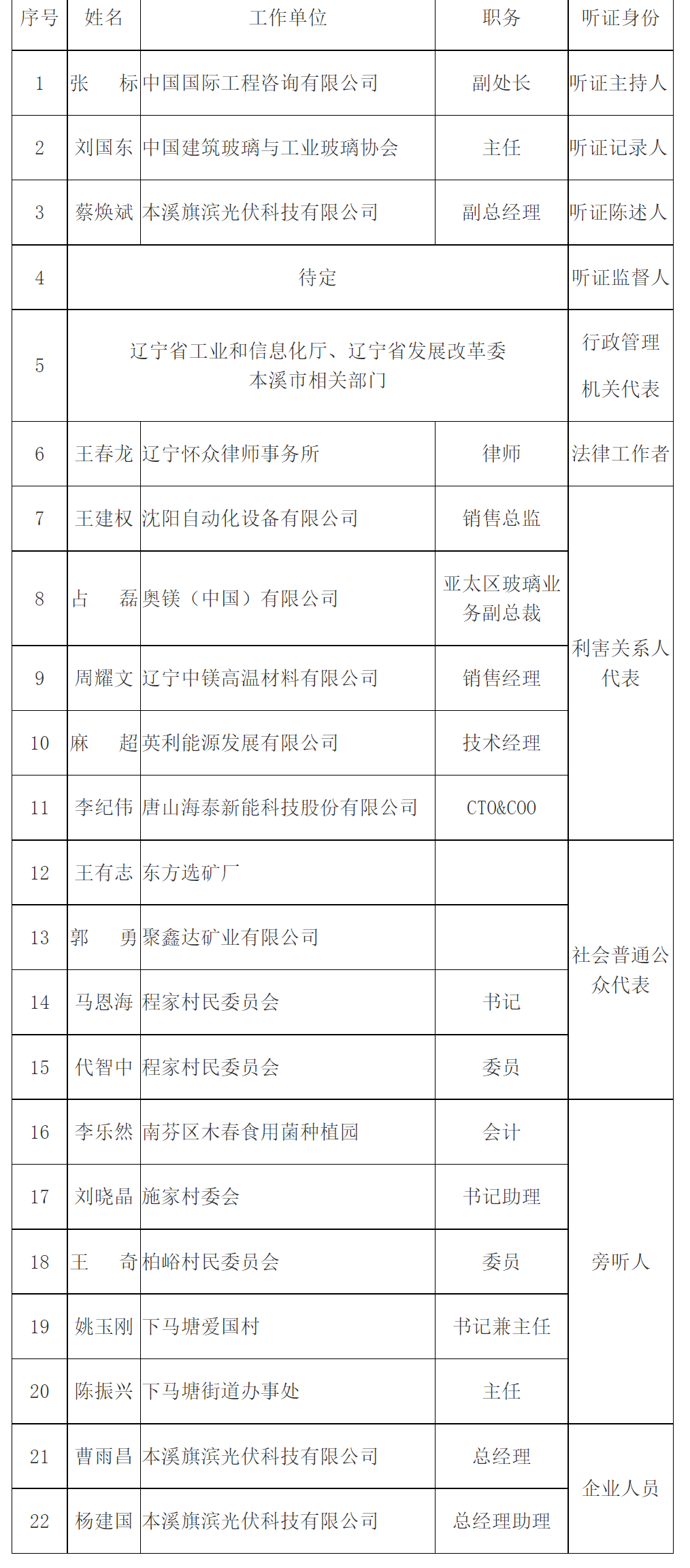 為貫徹落實(shí)《工業(yè)和信息化部關(guān)于印發(fā)水泥玻璃行業(yè)產(chǎn)能置換實(shí)施辦法的通知》(工信部原〔2021〕80號(hào))等文件精神,規(guī)范光伏壓延玻璃項(xiàng)目建設(shè),依據(jù)國(guó)家和遼寧省聽(tīng)證制度的有關(guān)規(guī)定,遼寧省發(fā)展改革委、遼寧省工業(yè)和信息化廳委托遼寧省國(guó)際工程咨詢中心有限公司、中國(guó)建筑玻璃與工業(yè)玻璃協(xié)會(huì)組織召開(kāi)本溪旗濱光伏科技有限公司4×1200t/d光伏高透基板項(xiàng)目(年產(chǎn)150萬(wàn)噸光伏高透基板材料及配套深加工生產(chǎn)線項(xiàng)目)聽(tīng)證會(huì),并公告報(bào)名等有關(guān)事項(xiàng)。經(jīng)過(guò)公開(kāi)自愿報(bào)名、推薦和邀請(qǐng)等方式抽簽產(chǎn)生了聽(tīng)證會(huì)參加人員,現(xiàn)將聽(tīng)證會(huì)召開(kāi)時(shí)間、地點(diǎn)及參會(huì)人員名單公示如下: