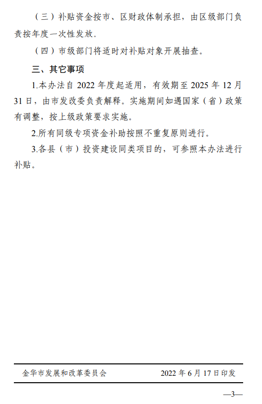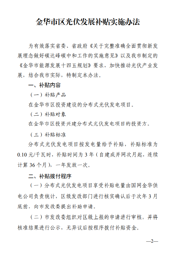 金華市發(fā)改委今日印發(fā)《金華市區(qū)光伏發(fā)展補貼實施辦法》,其中明確,對在金華市區(qū)投資興建分布式光伏發(fā)電項目的投資方,分布式光伏發(fā)電項目按發(fā)電量給予補貼,補貼標準為0.10元/千瓦時,補貼時間為3年(自建成并網(wǎng)次月起,連續(xù)計算36個月),一年發(fā)放一次。本辦法自2022年度起適用。