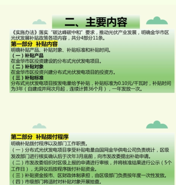 金華市發(fā)改委今日印發(fā)《金華市區(qū)光伏發(fā)展補貼實施辦法》,其中明確,對在金華市區(qū)投資興建分布式光伏發(fā)電項目的投資方,分布式光伏發(fā)電項目按發(fā)電量給予補貼,補貼標準為0.10元/千瓦時,補貼時間為3年(自建成并網(wǎng)次月起,連續(xù)計算36個月),一年發(fā)放一次。本辦法自2022年度起適用。主要內(nèi)容如下: