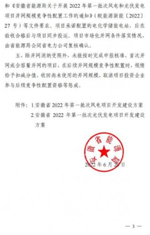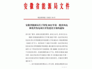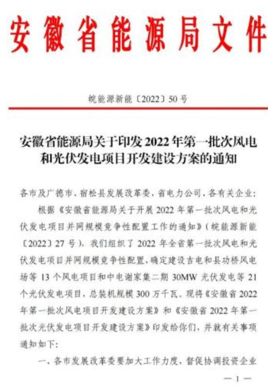 近日,安徽省能源局正式下發(fā)了《關(guān)于2022年第一批次風電和光伏發(fā)電項目開發(fā)建設(shè)方案》的通知。根據(jù)通知,全省組織了2022年全省第一批次風電和光伏發(fā)電項目并網(wǎng)規(guī)模競爭性配置,確定建設(shè)吉電和縣功橋風電場等13個風電項目和中電謝家集二期30MW光伏發(fā)電等21個光伏發(fā)電項目,總裝機規(guī)模300萬千瓦。光伏2GW、風電1GW。