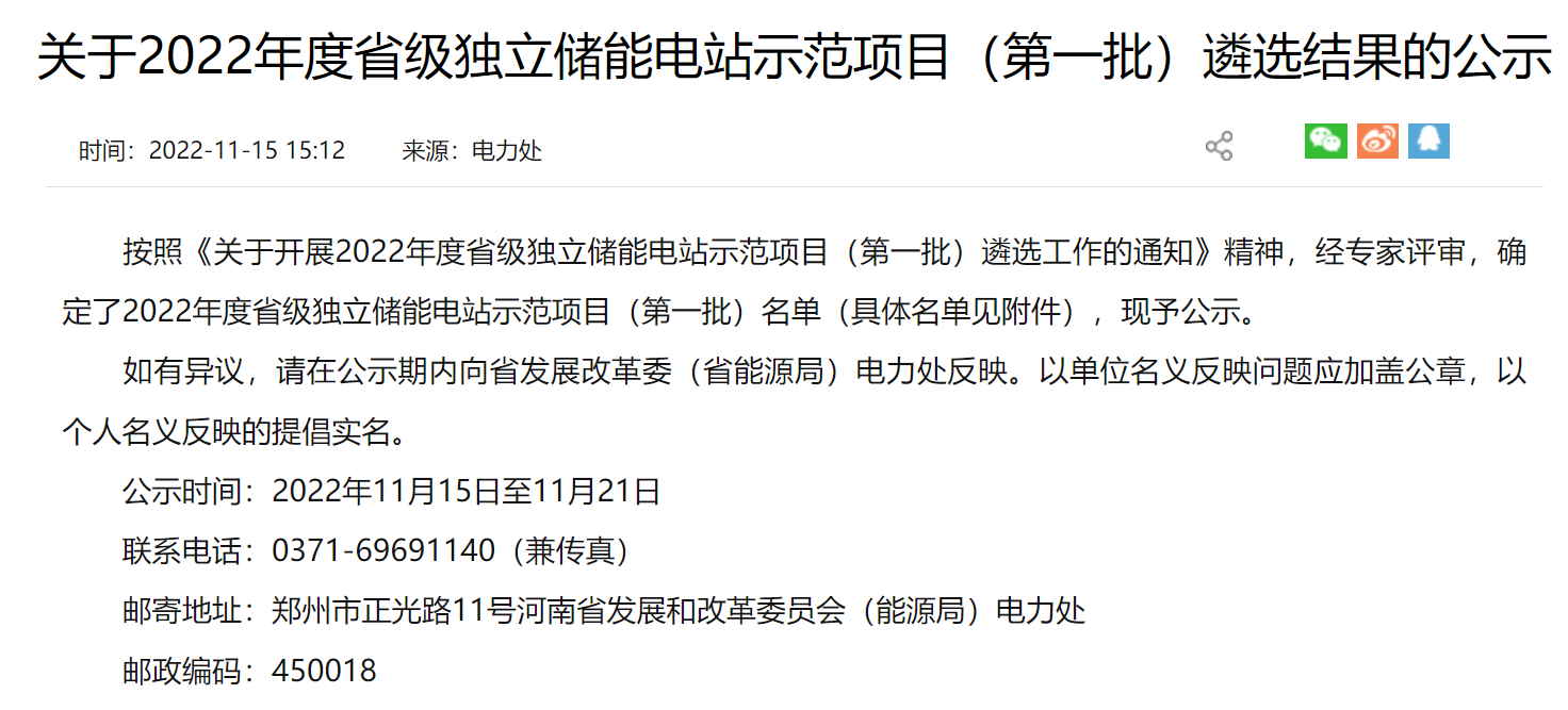 11月15日,河南省發(fā)改委公示2022年度省級獨(dú)立儲(chǔ)能電站示范項(xiàng)目(第一批)遴選名單。共有11個(gè)獨(dú)立儲(chǔ)能電站示范項(xiàng)目入選,總規(guī)模達(dá)1GW/2.2GWh。