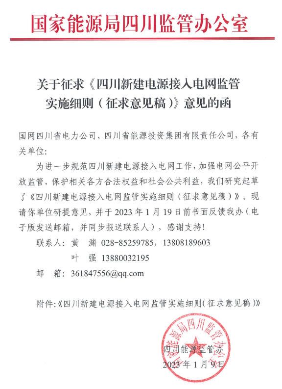 日前,四川能源監(jiān)管辦印發(fā)關于征求《四川新建電源接入電網(wǎng)監(jiān)管實施細則(征求意見稿)》意見的函,