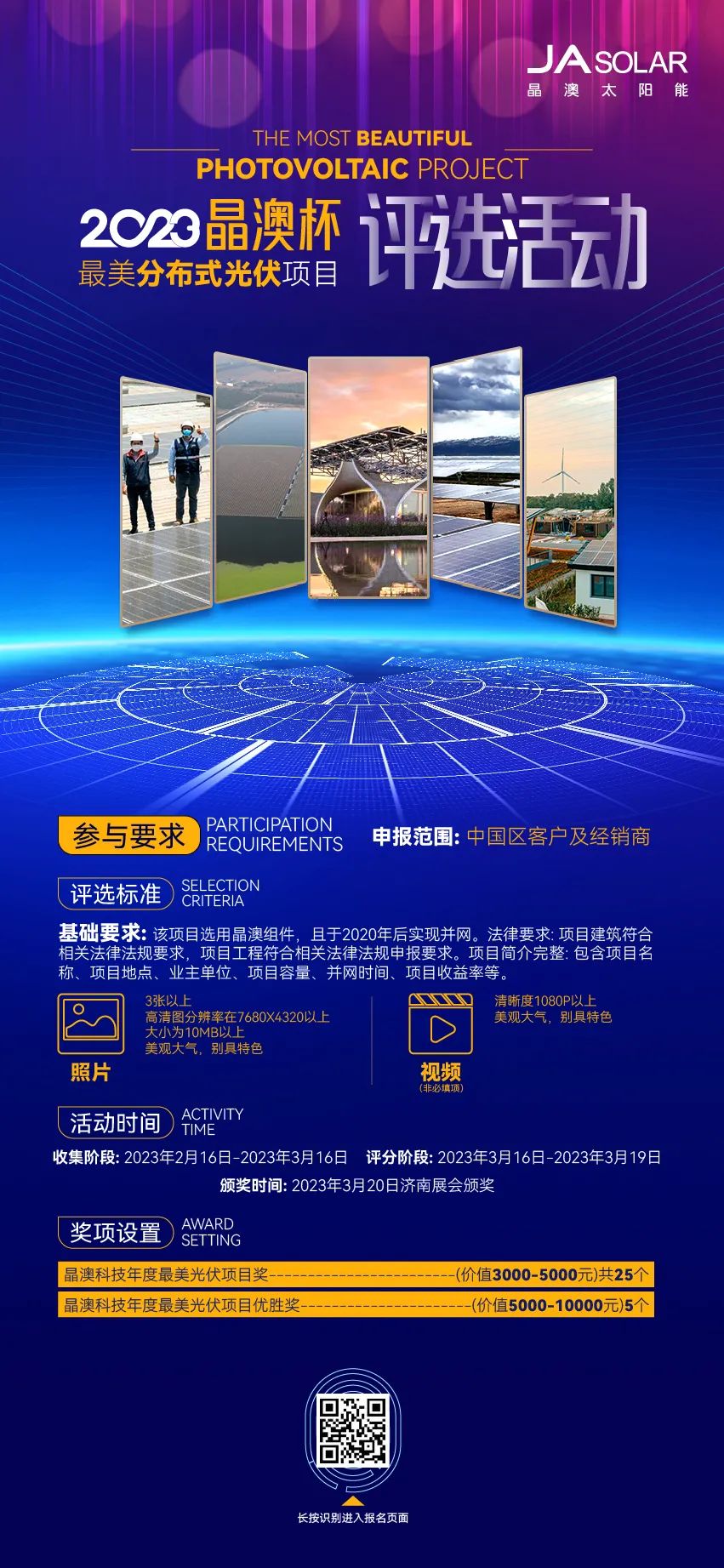 為集光伏人之精美創(chuàng)作,在會(huì)上正式啟動(dòng)2023“晶澳杯”最美分布式光伏項(xiàng)目評(píng)選活動(dòng),只要您選用了晶澳組件,即可報(bào)名此次活動(dòng),歡迎大家踴躍參加!