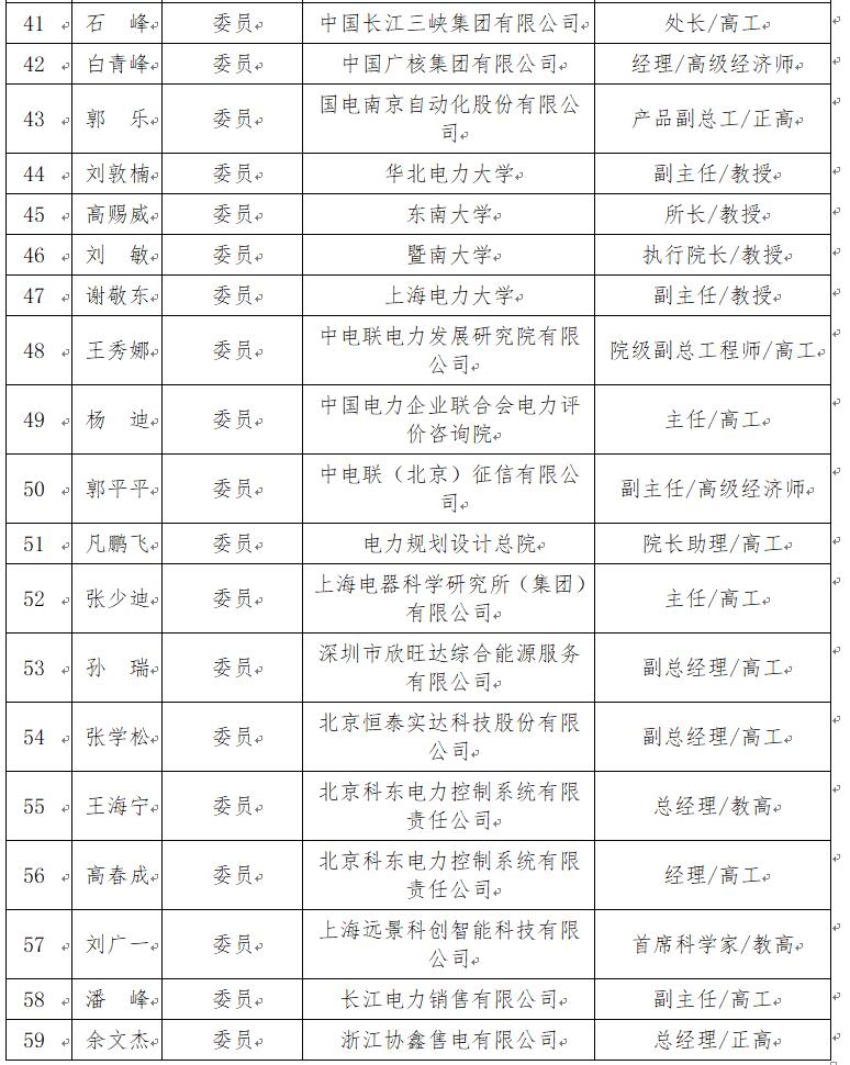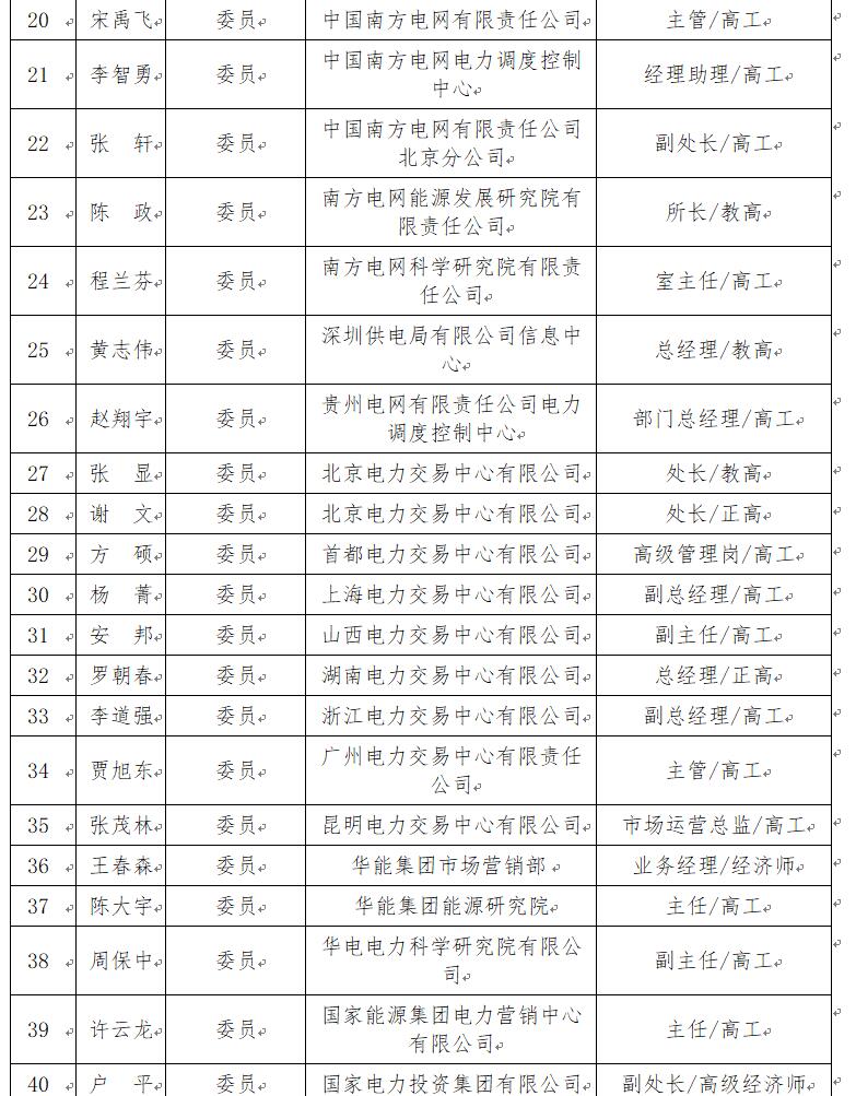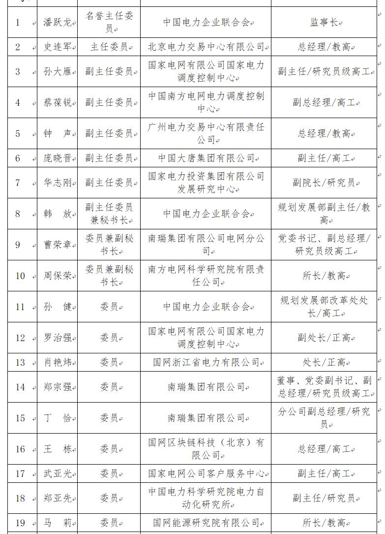 第一屆能源行業(yè)電力市場標準化技術委員會由59名委員組成(詳見下表),潘躍龍任名譽主任委員,史連軍任主任委員,孫大雁、蔡葆銳、鐘聲、龐曉晉、華志剛任副主任委員,韓放任副主任委員兼秘書長,曹榮章、周保榮任委員兼副秘書長。秘書處由中國電力企業(yè)聯(lián)合會、南瑞集團有限公司和南方電網(wǎng)科學研究院有限責任公司聯(lián)合承擔。
