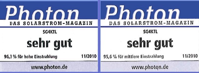 Photon給出的SG4KTL測(cè)評(píng)效率,左為高輻照條件,右為中等輻照條件。