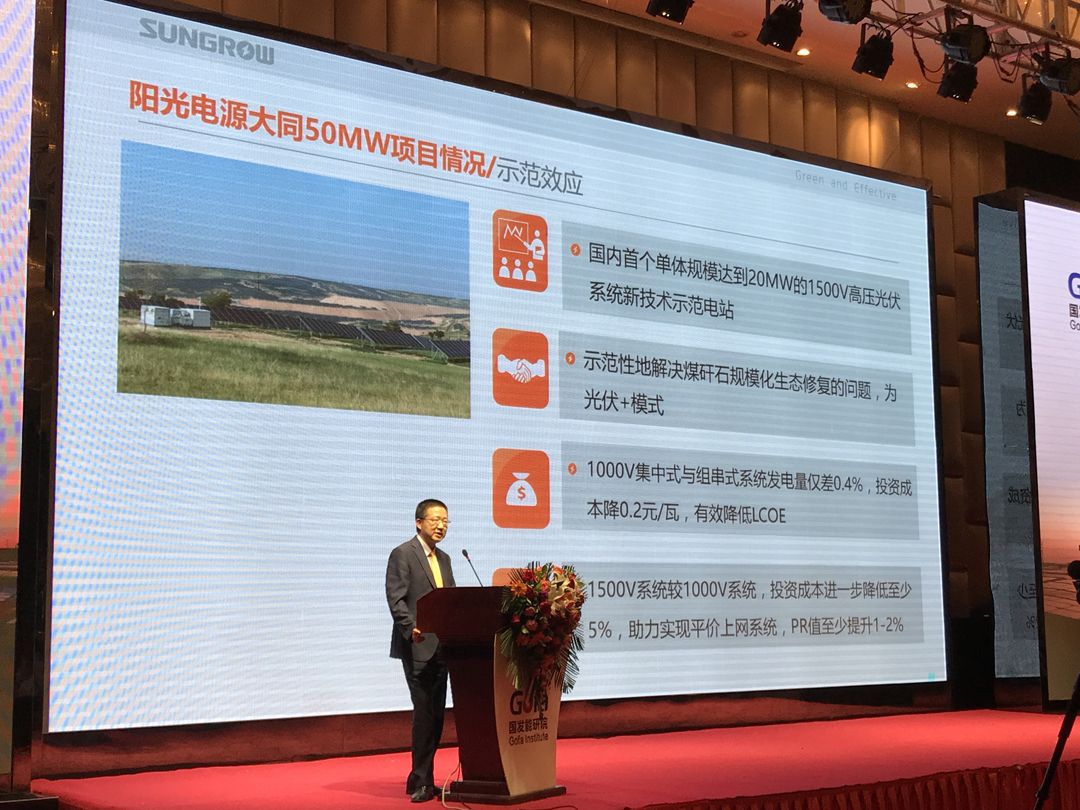 胡兵開門見山,以分享者的姿態(tài),將陽光電源在參與大同光伏“領(lǐng)跑者”基地建設(shè)近兩年來的努力和思考,向與會來賓和盤托出。胡兵介紹稱,陽光電源憑借二十年新能源發(fā)電領(lǐng)域的技術(shù)積累和創(chuàng)新能力,將直流1500V光伏技術(shù)、跟蹤系統(tǒng)技術(shù)、生態(tài)修復(fù)技術(shù)等前沿創(chuàng)新成果,充分展示和運(yùn)用在“領(lǐng)跑者”基地項(xiàng)目建設(shè)中。