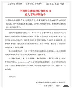 根據(jù)中國神華6月4日發(fā)布的公告,公司6月2日接到控股股東神華集團(tuán)有限責(zé)任公司通知,獲悉其“擬籌劃涉及本公司的重大事項”,該事項存在重大不確定性,尚需獲得有關(guān)主管部門批準(zhǔn)。為避免造成公司股價異常波動,經(jīng)申請,公司A股股票自5日起停牌。