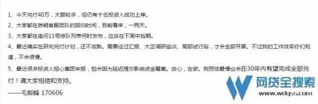 盡管30年的“龜速”還款計劃令不少投資者“吐血”,但至少還有盼頭。但到了6月15日,就有投資人在某論壇爆料,毛毅峰已經(jīng)辭職。據(jù)該人士透露,之前毛毅峰就表示要淡出投資人視線了,“說好的30年兌付呢,你卻偷偷的溜了”。