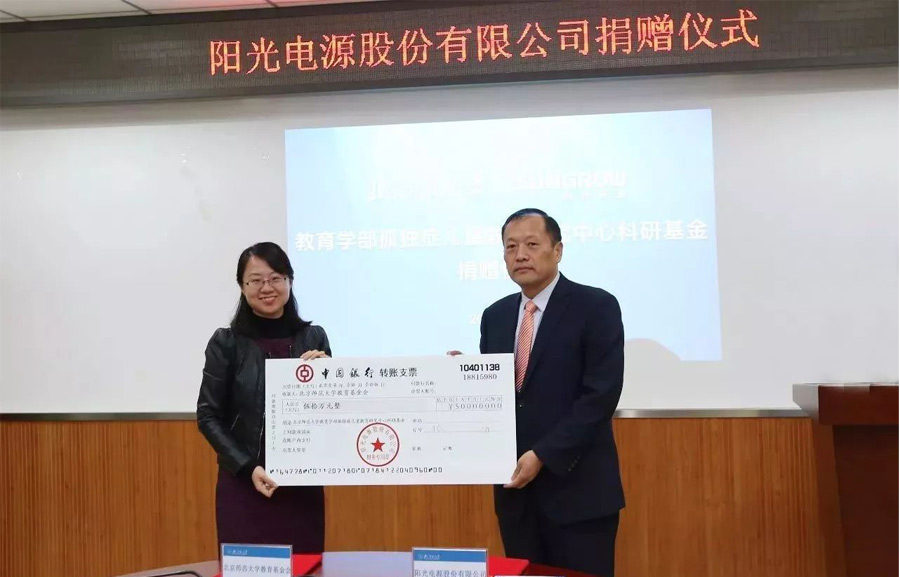 10月18日,北京師范大學(xué)英東樓,陽(yáng)光電源向北師大教育學(xué)部孤獨(dú)癥兒童教育研究中心捐贈(zèng)50萬元,支持該中心開展學(xué)齡孤獨(dú)癥兒童教學(xué)環(huán)境創(chuàng)設(shè)和教具開發(fā)工作,北師大教育基金會(huì)副秘書長(zhǎng)樊哲、教育學(xué)部學(xué)科建設(shè)辦公室主任劉洋、中心主