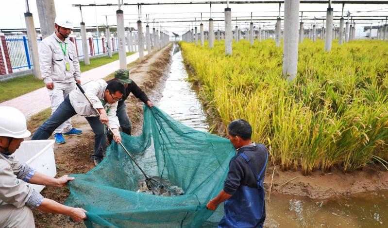10月25日下午,在江蘇省阜寧縣東溝鎮(zhèn)北堆村,協(xié)鑫集團(tuán)阜寧現(xiàn)代光伏農(nóng)業(yè)產(chǎn)業(yè)示范園的水稻田里,養(yǎng)殖戶朱國貴喜滋滋地捕撈鯽魚和螃蟹。經(jīng)江蘇省海洋漁業(yè)局漁業(yè)技術(shù)推廣中心主任、研究員張朝暉和鹽城市、阜寧縣的水產(chǎn)專家評估,稻魚蟹共生農(nóng)業(yè)畝均收獲魚類50公斤、蟹25公斤。張朝輝主任告訴在場的記者:協(xié)鑫新能源控股有限公司積