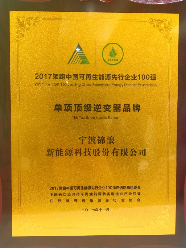 整合分布式能源優(yōu)質(zhì)資源,促進產(chǎn)業(yè)健康發(fā)展, 11月24-25日中國長江經(jīng)濟帶可再生能源裝備制造業(yè)產(chǎn)業(yè)聯(lián)盟聯(lián)合江蘇省可再生能源行業(yè)協(xié)會在南京召開第七屆加強應用長江經(jīng)濟帶“一帶一路”分布式能源創(chuàng)新發(fā)展論壇,錦浪科技與眾多企業(yè)家代表及來賓共同參與見證了此次行業(yè)盛會。論壇同期舉辦2017年領跑中國可再生能源先行企業(yè)100強頒獎活動,錦浪科技榮膺“2017領跑中國可再生能源先行企業(yè)100強-單項頂級品牌”獎。