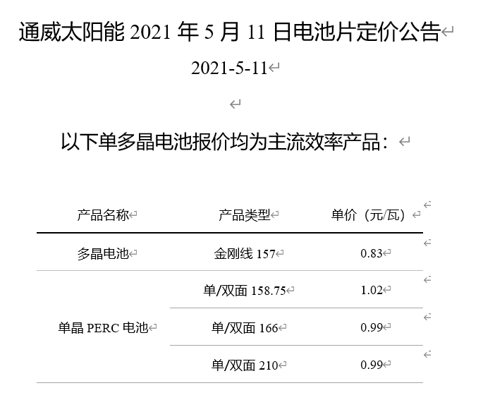 5月11日,通威官網(wǎng)發(fā)布最新電池片定價(jià)公告,距離上次報(bào)價(jià)僅隔5天。此次,通威電池片最新報(bào)價(jià)普漲6~7分/瓦。多晶157與M6電池片漲價(jià)0.07元/瓦,現(xiàn)價(jià)分別為0.83元/瓦、0.99元/瓦,漲幅為9.2% 與7.6%;G1與G12同步上調(diào)0.06元/瓦,現(xiàn)價(jià)分別為1.02元/瓦、0.99元/瓦,漲幅為6.25%與6.45%。
