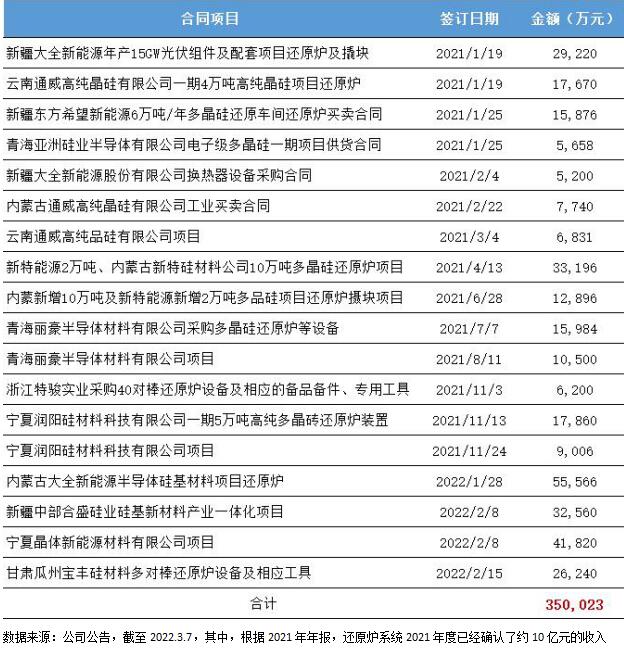 數(shù)據(jù)來源:公司公告,截至2022.3.7,其中,根據(jù)2021年年報,還原爐系統(tǒng)2021年度已經(jīng)確認了約10億元的收入