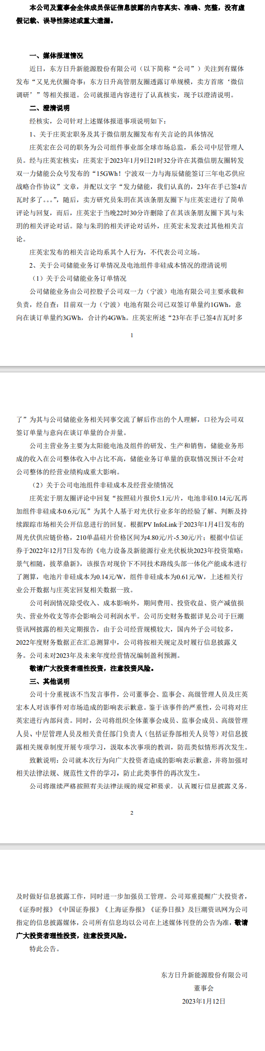 東方日升1月12日早間發(fā)布公告稱(chēng),近日,東方日升新能源股份有限公司關(guān)注到有媒體發(fā)布“又見(jiàn)光伏圈奇事:東方日升高管朋友圈透露訂單規(guī)模,賣(mài)方首席‘微信調(diào)研’”等相關(guān)報(bào)道。公司就報(bào)道內(nèi)容進(jìn)行了認(rèn)真核實(shí),現(xiàn)予以澄清說(shuō)明。