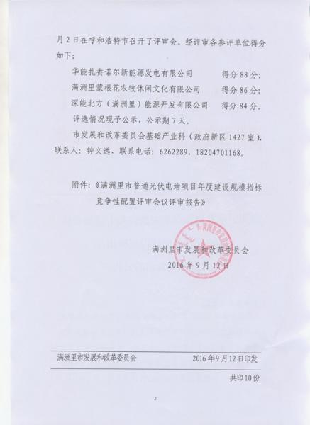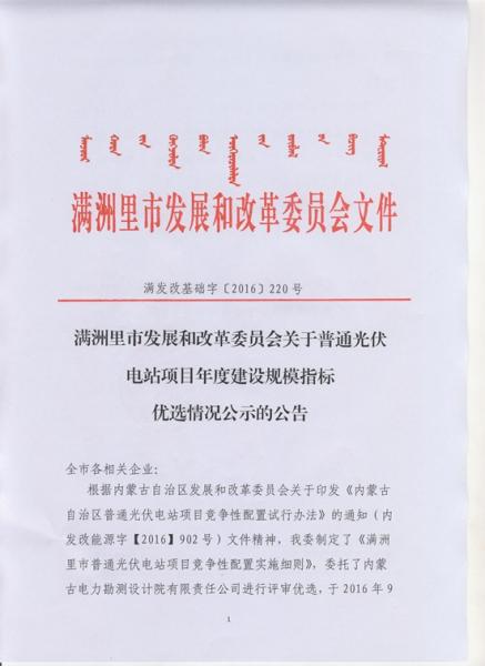 日前,內(nèi)蒙古滿洲里市發(fā)展和改革委員會(huì)發(fā)布了關(guān)于普通光伏電站項(xiàng)目年度建設(shè)規(guī)模指標(biāo)優(yōu)選情況公示的公告。