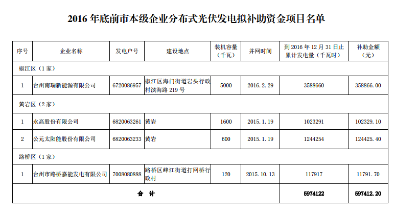 根據(jù)《臺州市人民政府辦公室關(guān)于扶持臺州市區(qū)分布式光伏發(fā)電項目的若干意見》(臺政辦發(fā)〔2015〕82號)文件精神,在市本級各區(qū)發(fā)改、財政及供電部門聯(lián)合申報的基礎(chǔ)上,市發(fā)改委、市財政局和臺州電業(yè)局對市本級2016年底前并網(wǎng)發(fā)電分布式光伏項目發(fā)電電量補助資金進行了匯總、審核,現(xiàn)將2016年底前市本級企業(yè)分布式