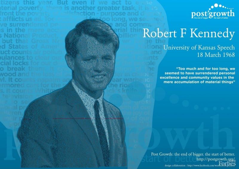 1968年3月,就在羅伯特•肯尼迪(Robert Kennedy,他是約翰•肯尼迪總統(tǒng)的弟弟)遇刺前不久,他在堪薩斯大學(University of Kansas)的一場畢業(yè)典禮上發(fā)表了演講,其中是這樣說:“我們的國民生產(chǎn)總值……包括了空氣污染和香煙廣告,以及為交通事故而奔忙的救護車,它包括了我們裝在門上的特種鎖和關(guān)撬鎖的人的監(jiān)獄,包括了我們對紅木森林的破壞和因城市無序蔓延而消失的自然奇觀。