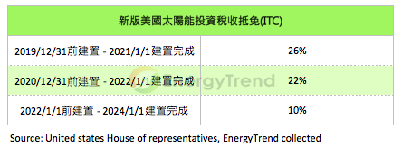 2015年12月16日凌晨,眾議院同意了延長(zhǎng)太陽(yáng)能投資稅收抵免(Investment Tax Credit, ITC)五年的修正案,目前已經(jīng)送往參議院,后續(xù)通過(guò)此法案的可能性高。根據(jù)文件內(nèi)容,原先于2016年12月31日將從30%下調(diào)至10%的ITC,將向后延長(zhǎng)五年至2022年,并依照開(kāi)始建置的時(shí)間給予不同額度的補(bǔ)貼,此修正案將自頒布日開(kāi)始生效。