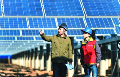 12月21日,天長(zhǎng)市供電公司員工在牧馬湖“漁光互補(bǔ)”發(fā)電站協(xié)助工程技術(shù)人員進(jìn)行交付前驗(yàn)收。