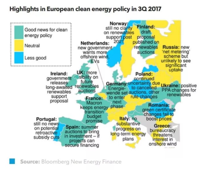 去年11月發(fā)布的“冬季一攬子計(jì)劃”終于在2017年第四季度迎來了一些進(jìn)展,極有可能成為歐洲能源政策改革的關(guān)鍵時(shí)期。目前,最有爭議的問題包括:可再生能源和能源效率目標(biāo)的具體水平、缺乏具有約束力的國家級目標(biāo),以及如何限制對煤電和天然氣等電廠的支持。