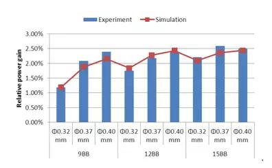 在林林總總的光伏相關(guān)技術(shù)中,電池片的主柵技術(shù)直接命中要害,兼具降本和提效的收益。下圖是業(yè)內(nèi)實(shí)驗(yàn)室將1000片多晶硅片做分組對(duì)照試驗(yàn)得出的不同主柵組件的試驗(yàn)功率增益和理論模擬功率增益圖,由分析可知,多主柵技術(shù)可以大幅降低銀漿耗量,同時(shí)提高組件的輸出功率,是未來技術(shù)發(fā)展的趨勢(shì)之一。
