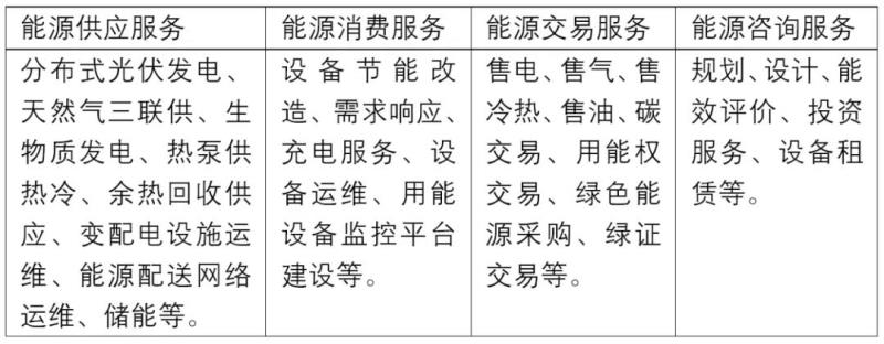 根據(jù)目前的產(chǎn)業(yè)實踐經(jīng)驗,綜合能源服務(wù)按照客戶對象主要分為兩類。一類面向園區(qū)客戶,綜合能源服務(wù)的“綜合”側(cè)重體現(xiàn)在提供不同品類能源的服務(wù),最終的形態(tài)是集成在一起。多能源品種包括冷、熱、電、氣等。另一類是面向個體客戶,例如工業(yè)企業(yè)、酒店、學(xué)校等單一決策主體,“綜合”側(cè)重體現(xiàn)在提供不同專業(yè)領(lǐng)域的能源服務(wù),最終的形態(tài)是組合在一起。多專業(yè)領(lǐng)域包括能源供應(yīng)服務(wù)、能源消費服務(wù)、能源交易服務(wù)、能源咨詢服務(wù)等。各類包含的技術(shù)和業(yè)務(wù)如下表所示。筆者總結(jié)綜合能源服務(wù)的內(nèi)涵是指以滿足客戶與能源相關(guān)的安全、經(jīng)濟、環(huán)保、品質(zhì)等綜合需求為導(dǎo)向,為客戶提供的綜合多能源品種或者綜合多專業(yè)領(lǐng)域的能源服務(wù)。