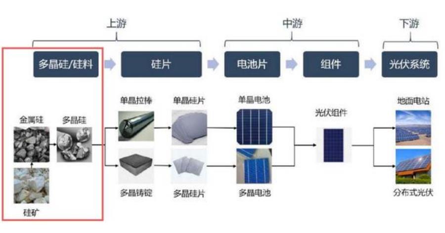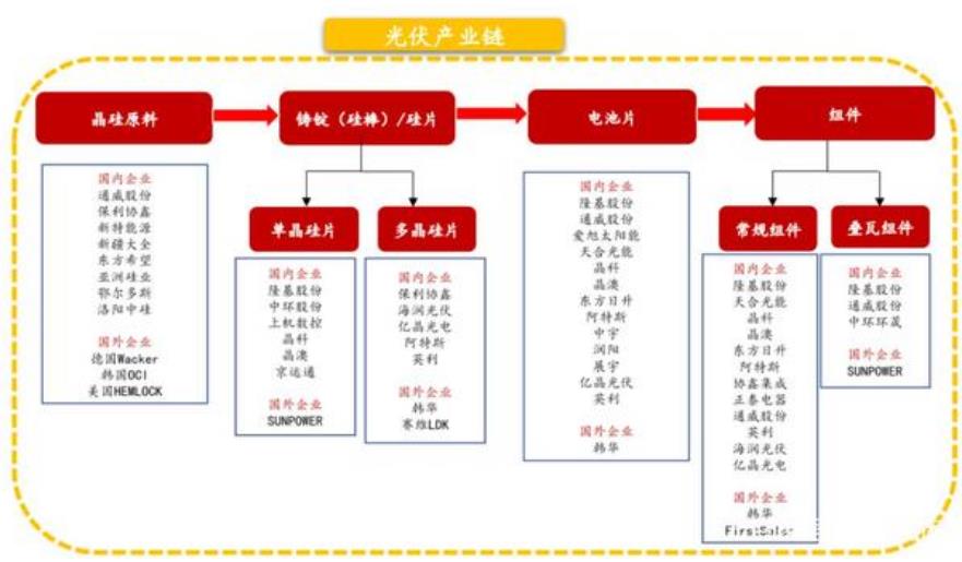 光伏產(chǎn)業(yè)鏈大致可分為多晶硅、硅片,中游電池片、組件,以及下游光伏發(fā)電系統(tǒng)三大環(huán)節(jié)。