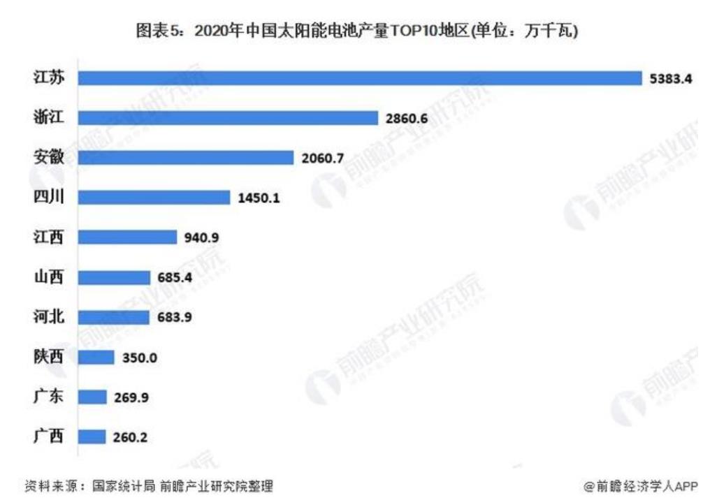 2020年,在我國太陽能電池的生產(chǎn)地區(qū)中,華東地區(qū)電池產(chǎn)量最多,占全國產(chǎn)量的73.2%;西南地區(qū)產(chǎn)量排在第二位,電池產(chǎn)量占比為7.42%。