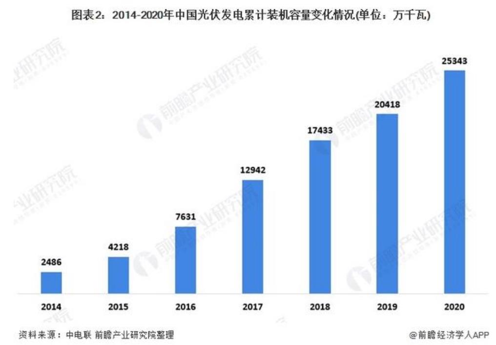 截至2020年底,我國他太陽能發(fā)電累計裝機容量達25343萬千瓦,較2019年增加了4925萬千瓦,同比增長24.1%。
