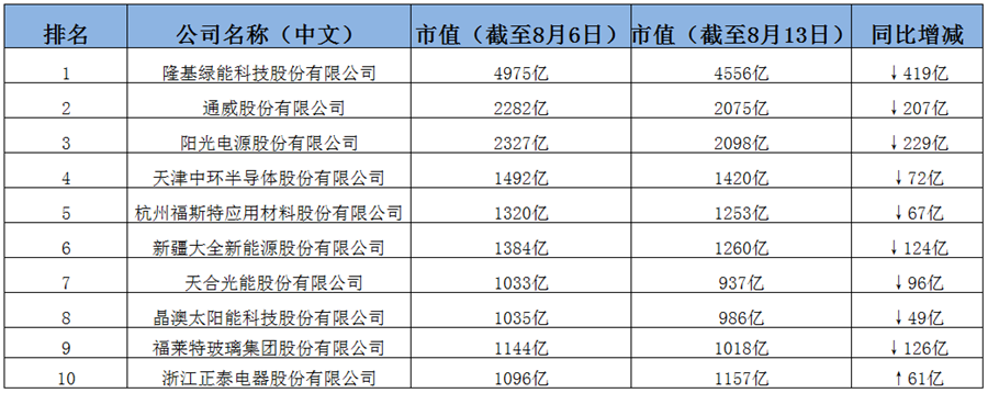據(jù)維科網(wǎng)光伏統(tǒng)計(jì),過去一周,市值排名前十的光伏企業(yè),九家出現(xiàn)下滑。其中,領(lǐng)頭羊隆基股份下滑419億、通威股份下滑207億、天合光能和晶澳科技的下滑,更是讓其掉出了千億企業(yè)的隊(duì)伍。唯一的例外,只有正泰電器,綜合下來,十家企業(yè)一周蒸發(fā)了1328億元!盡管期間有儲(chǔ)能概念力挽狂瀾,也無濟(jì)于事!